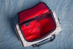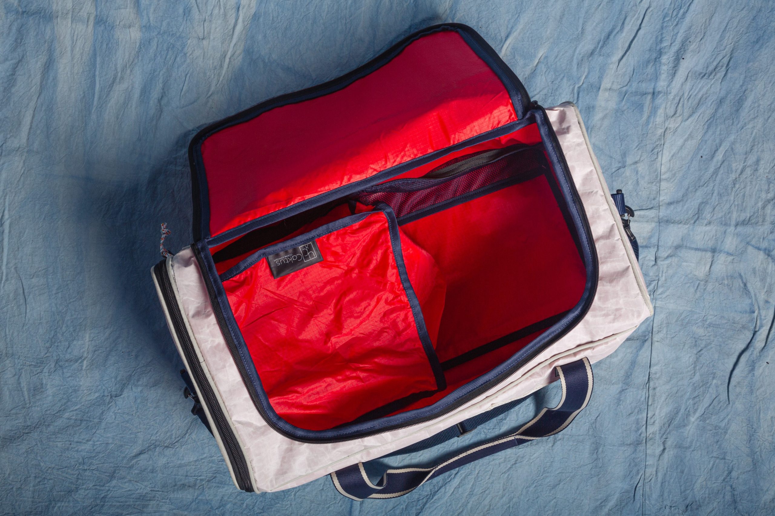 A Mala Laser 40 litros possui forro interno de ripstop de balão cores conforme tecidos disponíveis, e tecido externo de dacron branco. Podem possuir tons amarelados ou manchas devido ao produto ser originado de velas náuticas de desuso, costuras externas aparentes da vela.
