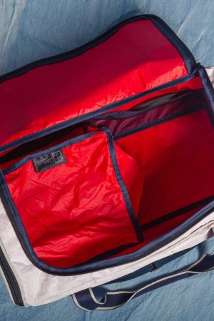 Corpo Dracon branco, forro em ripstop, zíper Ykk, bolsosaco externo lateral com zíper, alça de mão e ombro destacável.