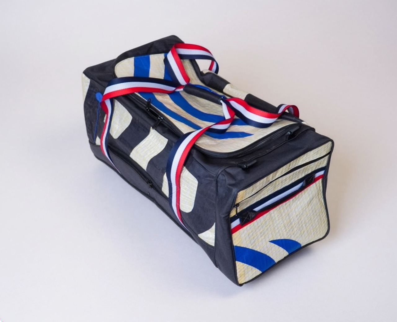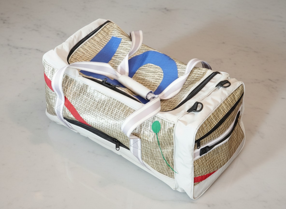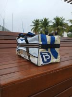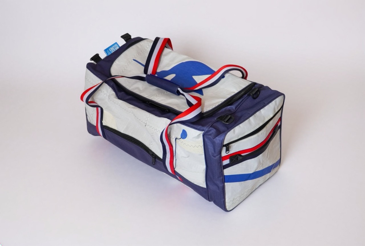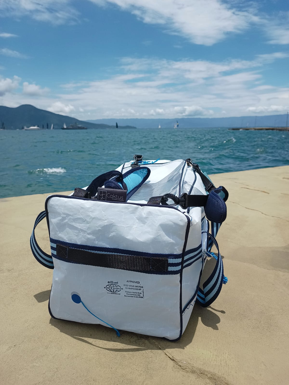 Mala Vento 60 litros produzida com velas náuticas descartadas de materiais como Dacron na cor branca, nylon reaproveitado das velas tipo balão e base em dacron reforçado, podendo ter numerais se houverem velas disponíveis.
